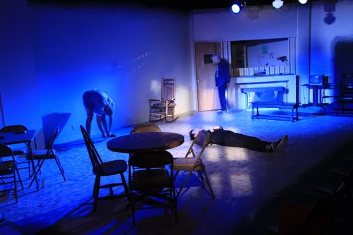 I designed and constructed the set and lighting for The Chain Theatre at The American Theatre of Actors. This was a blackbox theatre. We built three levels of stage above the floor with reclaimed platforms.