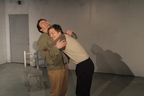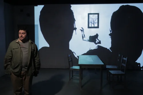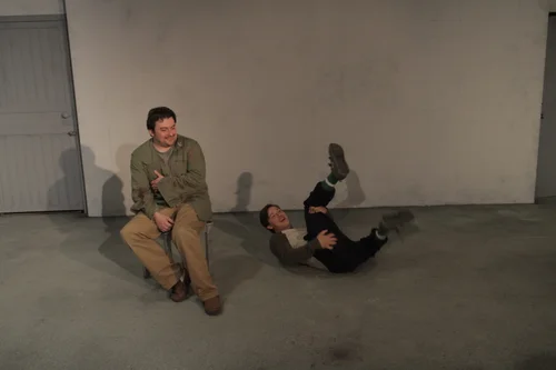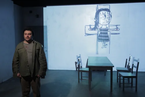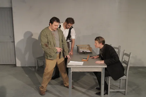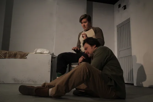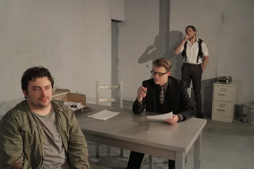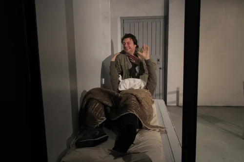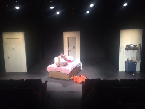 The proscenium transformed into a mattress pallet that also served to hide the interrogation room table when the scene shifting into the holding cell.
